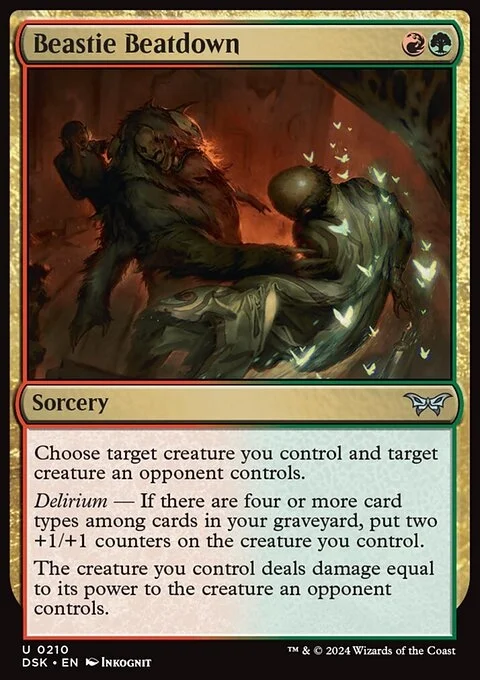 Choose target creature you control and target creature an opponent controls. Delirium — If there are four or more card types among cards in your graveyard, put two +1/+1 counters on the creature you control. The creature you control deals damage equal to its power to the creature an opponent controls.