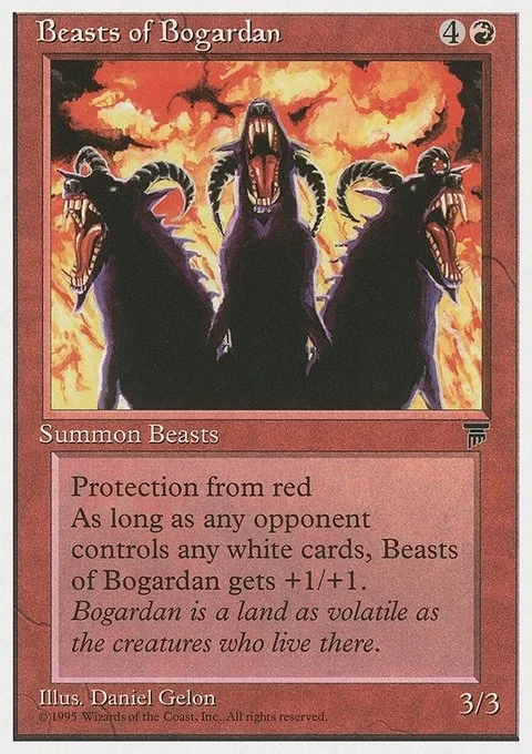 Protection from redGains +1/+1 if an opponent controls any white cards.