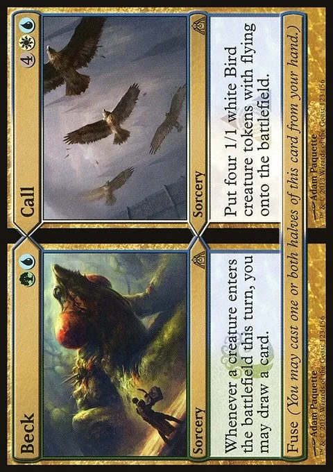 Beck Whenever a creature enters the battlefield this turn, you may draw a card. Fuse (You may cast one or both halves of this card from your hand.) Call Create four 1/1 white Bird creature tokens with flying. Fuse (You may cast one or both halves of this card from your hand.)