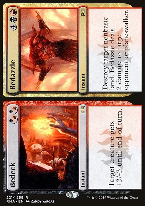 Bedeck Target creature gets +3/-3 until end of turn. Bedazzle Destroy target nonbasic land. Bedazzle deals 2 damage to target opponent or planeswalker.