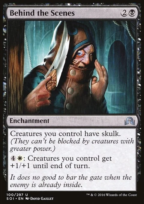 Creatures you control have skulk. (They can't be blocked by creatures with greater power.) {4}{W}: Creatures you control get +1/+1 until end of turn.