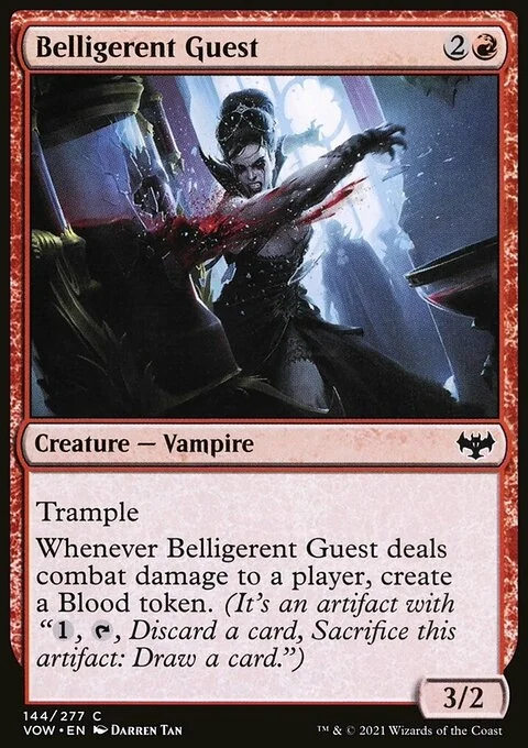 Trample (This creature can deal excess combat damage to the player or planeswalker it's attacking.) Whenever this creature deals combat damage to a player, create a Blood token. (It's an artifact with "{1}, {T}, Discard a card, Sacrifice this token: Draw a card.")
