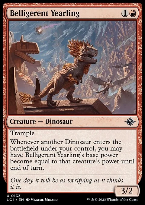 Trample Whenever another Dinosaur enters the battlefield under your control, you may have Belligerent Yearling's base power become equal to that creature's power until end of turn.
