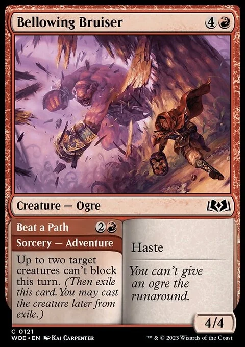 Bellowing Bruiser Haste Beat a Path Up to two target creatures can't block this turn. (Then exile this card. You may cast the creature later from exile.)