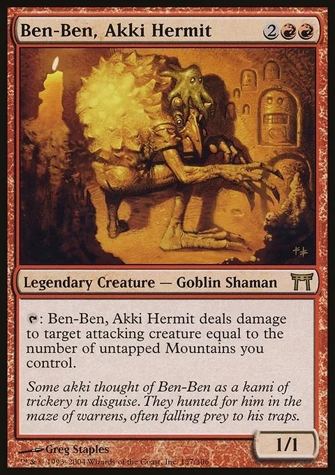 {T}: Ben-Ben, Akki Hermit deals damage to target attacking creature equal to the number of untapped Mountains you control.