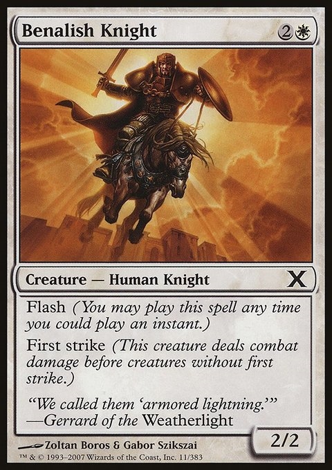 Flash (You may cast this spell any time you could cast an instant.) First strike (This creature deals combat damage before creatures without first strike.)
