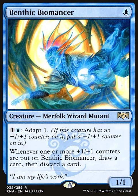 {1}{U}: Adapt 1. (If this creature has no +1/+1 counters on it, put a +1/+1 counter on it.) Whenever one or more +1/+1 counters are put on Benthic Biomancer, draw a card, then discard a card.