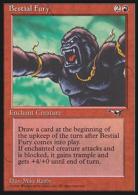 Enchant creature When Bestial Fury enters the battlefield, draw a card at the beginning of the next turn's upkeep. Whenever enchanted creature becomes blocked, it gets +4/+0 and gains trample until end of turn.