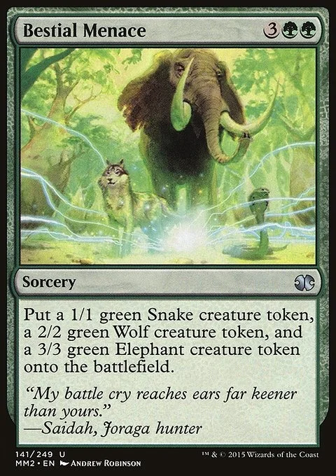 Create a 1/1 green Snake creature token, a 2/2 green Wolf creature token, and a 3/3 green Elephant creature token.