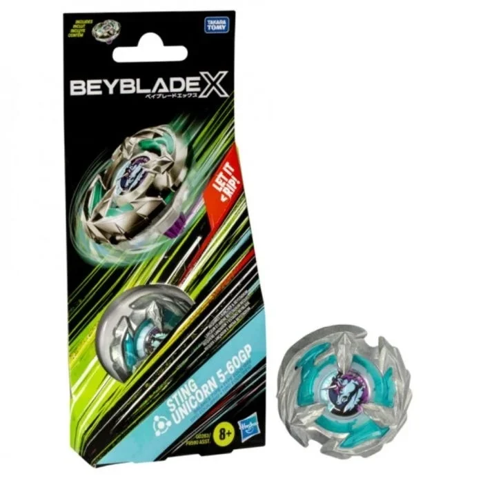 • HARNESS THE POWER: Includes Takara Tomy-designed Beyblade X top with authentic die-cast metal parts: Sting Unicorn 5-60GP Right-Spin Balance Type. The combination of attack and defense points provide a strong balanced blade