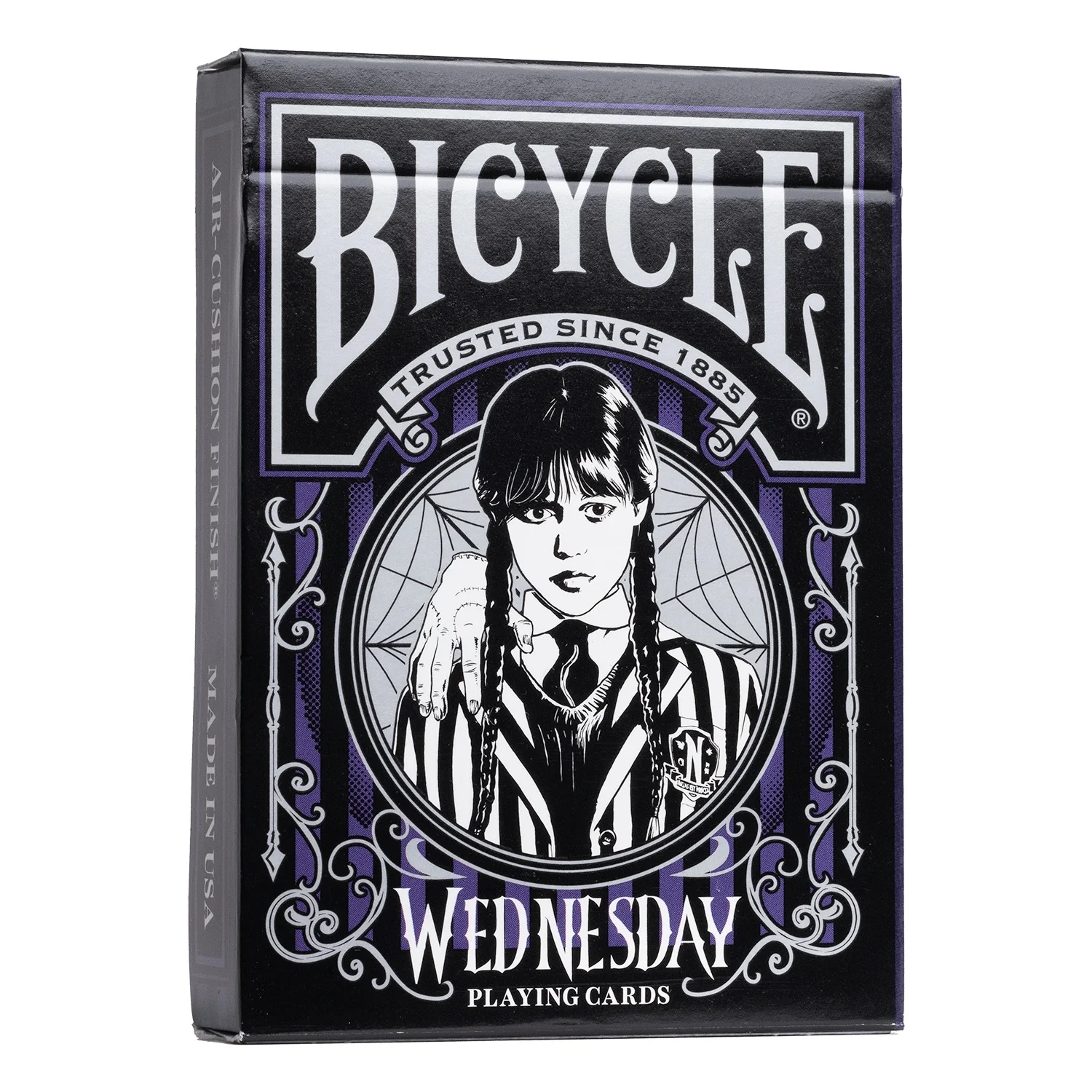 Step into the shadowy world of Nevermore Academy with Bicycle Wednesday Playing Cards! Inspired by the hit Netflix series starring Jenna Ortega as Wednesday Addams; your next card game is all-in for the thrilling dance with the macabre as you shuffle through the inky black cards featuring fan-favorite characters from the show.