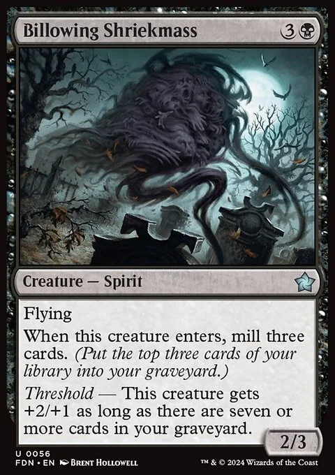 Flying When this creature enters, mill three cards. (Put the top three cards of your library into your graveyard.) Threshold — This creature gets +2/+1 as long as there are seven or more cards in your graveyard.