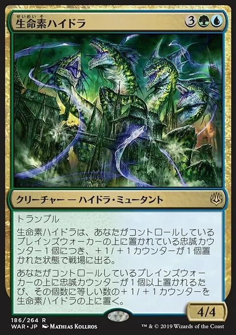 Trample Bioessence Hydra enters the battlefield with a +1/+1 counter on it for each loyalty counter on planeswalkers you control. Whenever one or more loyalty counters are put on planeswalkers you control, put that many +1/+1 counters on Bioessence Hydra.