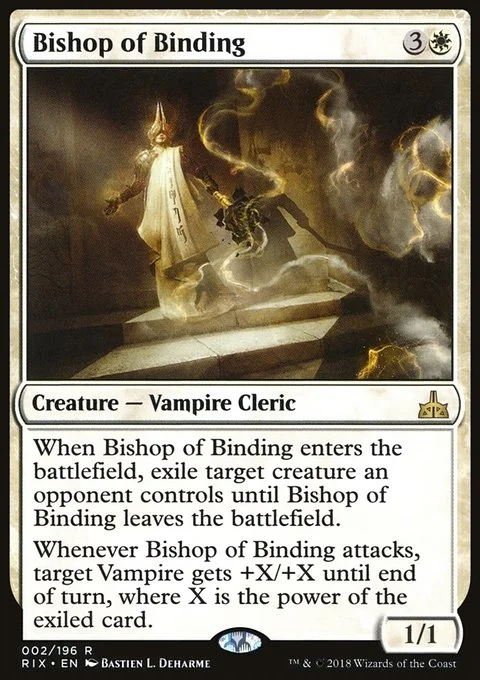 Whenever Bishop of Binding attacks, target Vampire gets +X/+X until end of turn, where X is the power of the exiled card.