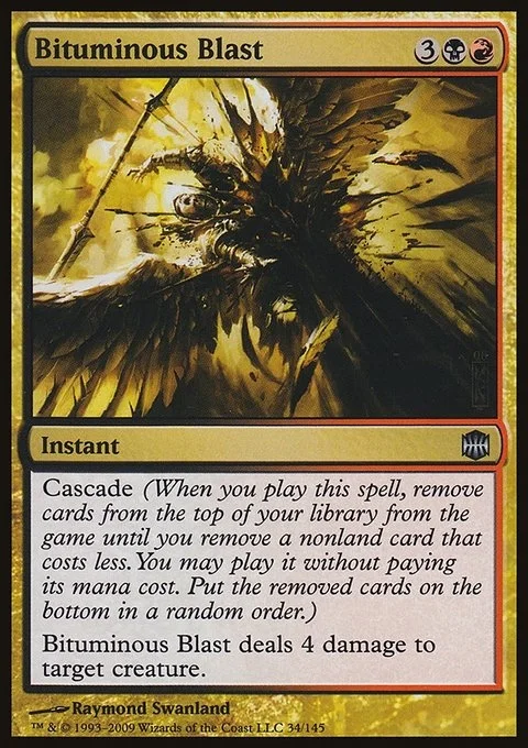 Cascade (When you cast this spell, exile cards from the top of your library until you exile a nonland card that costs less. You may cast it without paying its mana cost. Put the exiled cards on the bottom of your library in a random order.) Bituminous Blast deals 4 damage to target creature.