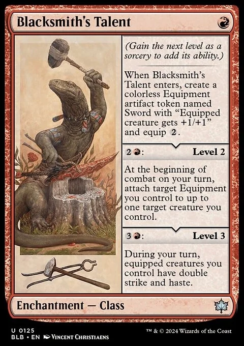 When Blacksmith's Talent enters, create a colorless Equipment artifact token named Sword with "Equipped creature gets +1/+1" and equip {2}.