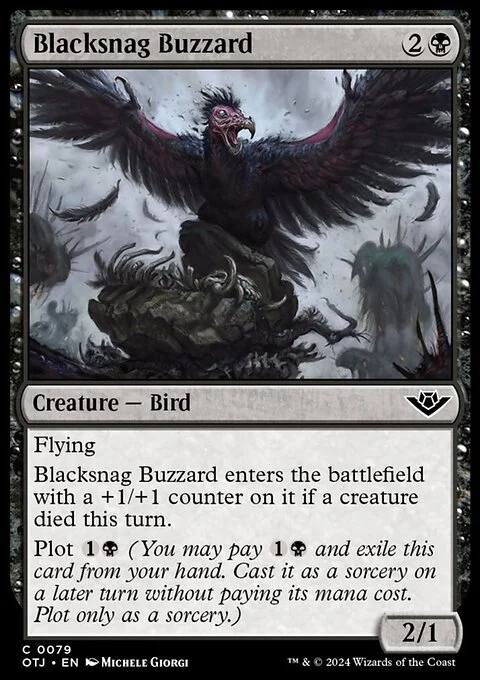 Flying This creature enters with a +1/+1 counter on it if a creature died this turn. Plot {1}{B} (You may pay {1}{B} and exile this card from your hand. Cast it as a sorcery on a later turn without paying its mana cost. Plot only as a sorcery.)