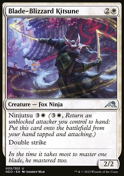 Ninjutsu {3}{W} ({3}{W}, Return an unblocked attacker you control to hand: Put this card onto the battlefield from your hand tapped and attacking.) Double strike