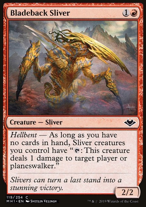 Hellbent — As long as you have no cards in hand, Sliver creatures you control have "{T}: This creature deals 1 damage to target player or planeswalker."