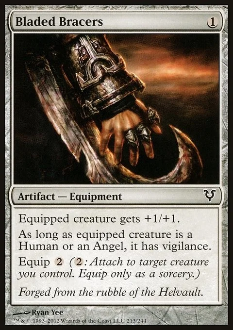 Equipped creature gets +1/+1. As long as equipped creature is a Human or an Angel, it has vigilance. Equip {2} ({2}: Attach to target creature you control. Equip only as a sorcery.)