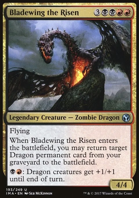 Flying When Bladewing the Risen enters the battlefield, you may return target Dragon permanent card from your graveyard to the battlefield. {B}{R}: Dragon creatures get +1/+1 until end of turn.