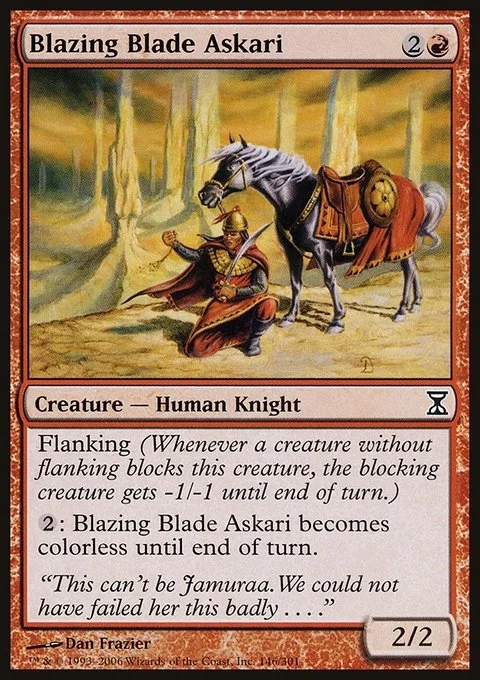Flanking (Whenever a creature without flanking blocks this creature, the blocking creature gets -1/-1 until end of turn.) {2}: Blazing Blade Askari becomes colorless until end of turn.