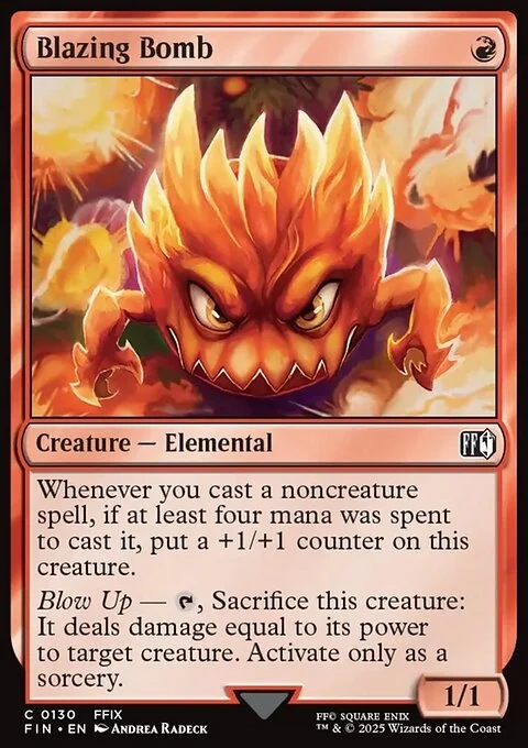 Whenever you cast a noncreature spell, if at least four mana was spent to cast it, put a +1/+1 counter on this creature. Blow Up — {T}, Sacrifice this creature: It deals damage equal to its power to target creature. Activate only as a sorcery.