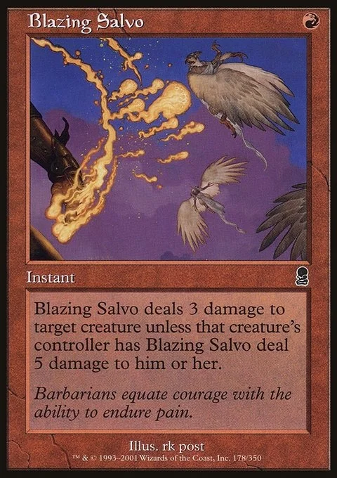 Blazing Salvo deals 3 damage to target creature unless that creature's controller has Blazing Salvo deal 5 damage to them.
