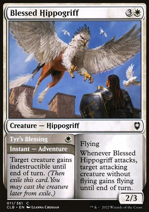 Blessed Hippogriff Flying Whenever this creature attacks, target attacking creature without flying gains flying until end of turn. Tyr's Blessing Target creature gains indestructible until end of turn. (Then exile this card. You may cast the creature later from exile.)