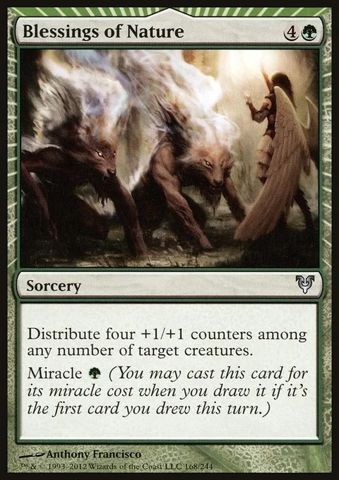 Distribute four +1/+1 counters among any number of target creatures. Miracle {G} (You may cast this card for its miracle cost when you draw it if it's the first card you drew this turn.)