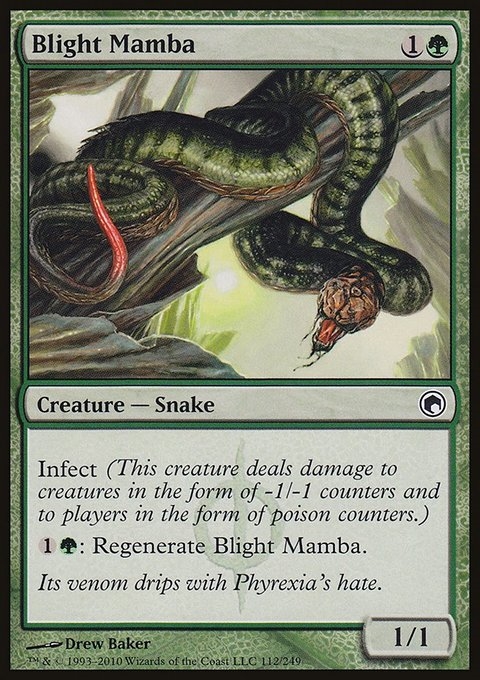 Infect (This creature deals damage to creatures in the form of -1/-1 counters and to players in the form of poison counters.) {1}{G}: Regenerate Blight Mamba.