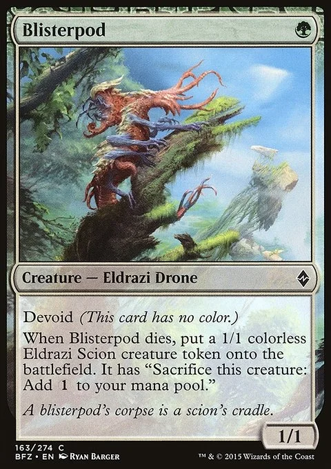Devoid (This card has no color.) When Blisterpod dies, create a 1/1 colorless Eldrazi Scion creature token. It has "Sacrifice this creature: Add {C}."