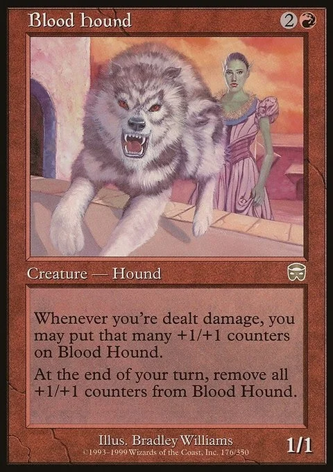 Whenever you’re dealt damage, you may put that many +1/+1 counters on Blood Hound.