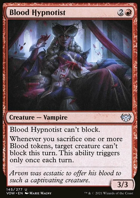 Blood Hypnotist can't block. Whenever you sacrifice one or more Blood tokens, target creature can't block this turn. This ability triggers only once each turn.