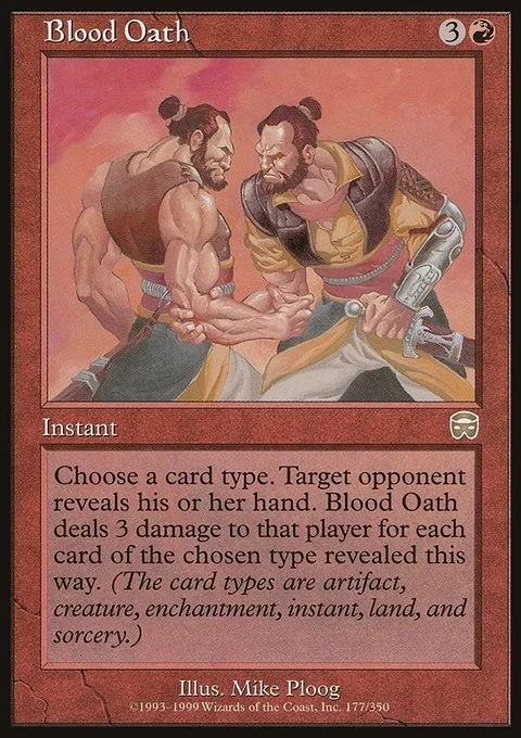 Choose a card type. Target opponent reveals his or her hand. Blood Oath deals 3 damage to that player for each card of the chosen type revealed this way. (The card types are artifact, creature, enchantment, instant, land, and sorcery.)