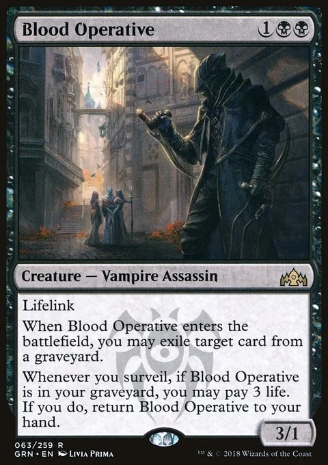 Lifelink When Blood Operative enters the battlefield, you may exile target card from a graveyard. Whenever you surveil, if Blood Operative is in your graveyard, you may pay 3 life. If you do, return Blood Operative to your hand.