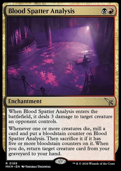 Whenever one or more creatures die, mill a card and put a bloodstain counter on Blood Spatter Analysis. Then sacrifice it if it has five or more bloodstain counters on it. When you do, return target creature card from your graveyard to your hand.
