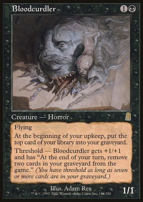 Flying At the beginning of your upkeep, mill a card. Threshold — As long as seven or more cards are in your graveyard, Bloodcurdler gets +1/+1 and has "At the beginning of your end step, exile two cards from your graveyard."