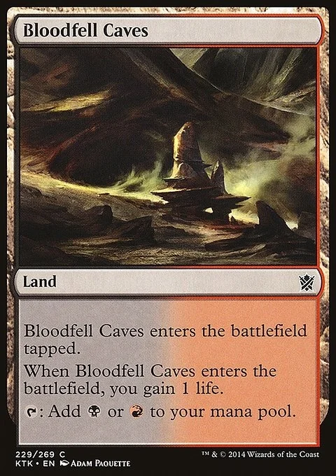 Bloodfell Caves enters the battlefield tapped. When Bloodfell Caves enters the battlefield, you gain 1 life. {T}: Add {B} or {R}.