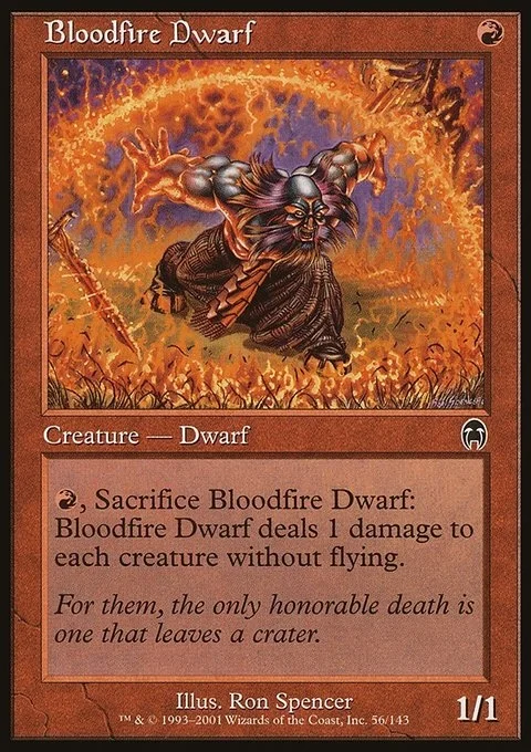 {R}, Sacrifice Bloodfire Dwarf: It deals 1 damage to each creature without flying.