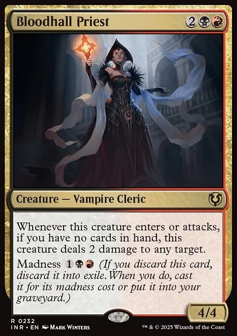 Whenever Bloodhall Priest enters or attacks, if you have no cards in hand, Bloodhall Priest deals 2 damage to any target.