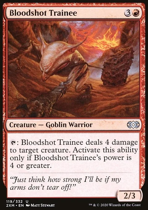 {T}: Bloodshot Trainee deals 4 damage to target creature. Activate this ability only if Bloodshot Trainee's power is 4 or greater.