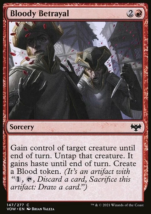 Gain control of target creature until end of turn. Untap that creature. It gains haste until end of turn. Create a Blood token. (It's an artifact with "{1}, {T}, Discard a card, Sacrifice this token: Draw a card.")