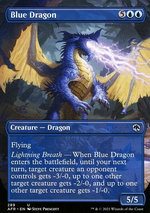 Flying Lightning Breath — When Blue Dragon enters the battlefield, until your next turn, target creature an opponent controls gets -3/-0, up to one other target creature gets -2/-0, and up to one other target creature gets -1/-0.