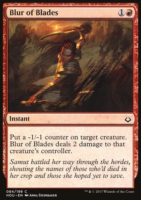 Put a -1/-1 counter on target creature. Blur of Blades deals 2 damage to that creature's controller.