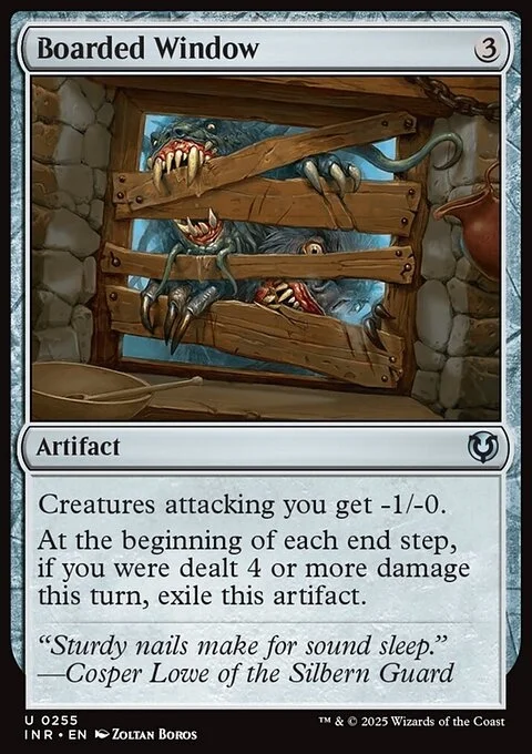 Creatures attacking you get -1/-0. At the beginning of each end step, if you were dealt 4 or more damage this turn, exile Boarded Window.