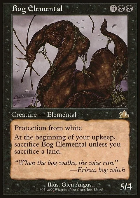 Protection from white At the beginning of your upkeep, sacrifice Bog Elemental unless you sacrifice a land.