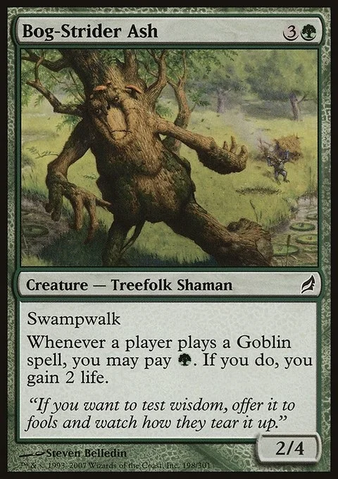Swampwalk (This creature can't be blocked as long as defending player controls a Swamp.) Whenever a player casts a Goblin spell, you may pay {G}. If you do, you gain 2 life.