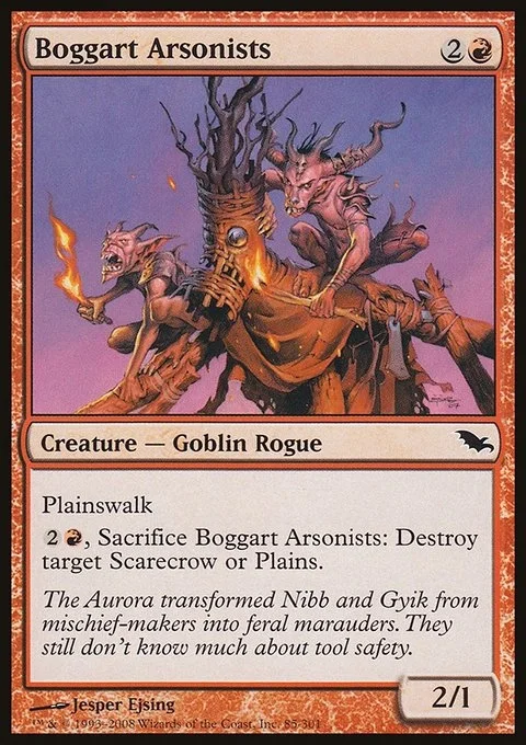 Plainswalk (This creature can't be blocked as long as defending player controls a Plains.) {2}{R}, Sacrifice Boggart Arsonists: Destroy target Scarecrow or Plains.