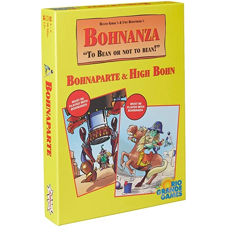 This expansion adds game variants and two new bean types, the Cognac bean and the Field bean. With High Bohn, the players may spend their gold coins on buildings located in Virginia City. These building have attributes that give the players new tactics for winning. The Plus part of this expansion adds order cards which allow players to earn extra gold coins when they can fill very specific orders